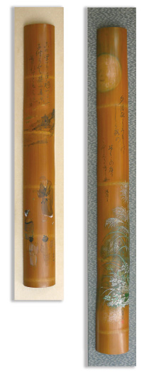 奥伊豆から修善寺にかけては、見事な竹林が多い。竹質の良さにも定評がある。その竹-孟宗竹に彫りをほどこす修禅寺彫は、昭和初期、鍵和田松翠翁によって創始された。 名刹・修禅寺の御加護を受け、門前で彫り仕事を始めたのが最初である。 松翠翁は人間的にも独特の風格のある名人肌で、その作品にも言い難い滋味があった。後年、その精神と技は、娘の松琴に余すところなく受け継がれていった。初代の厳しさに加えて、流麗さと艶を含む、松琴の彫竹の独創性と格調は、やがて、毎日書道展をはじめとする、国内外の展覧会の多くにおいても、高い評価を得ていった。